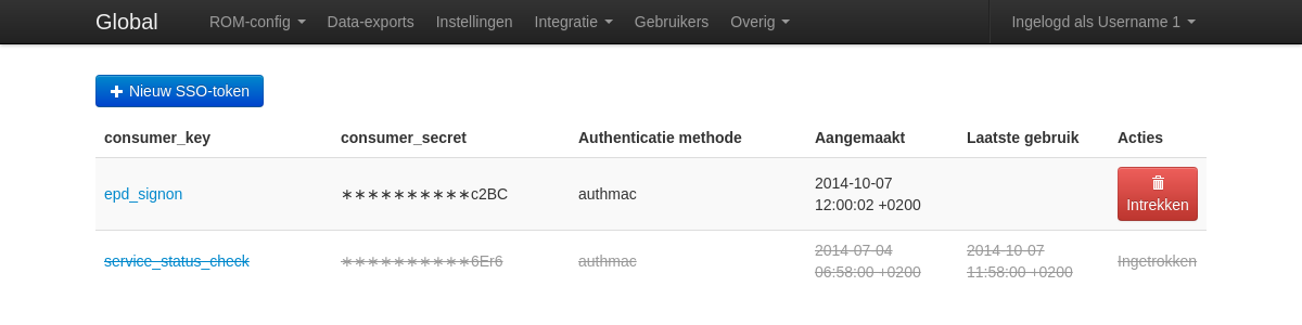 Om te zorgen dat een token niet langer toegang heeft tot RoQua kan deze worden ingetrokken. Ingetrokken tokens blijven staan in het overzicht.