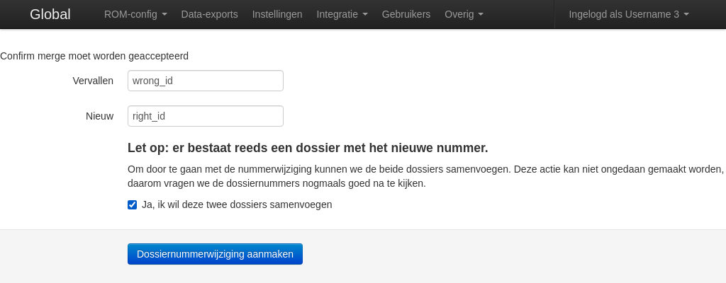 - Wanneer het nieuwe nummer van een dossier reeds bestaat, wordt eerst om bevestiging van samenvoegen gevraagd. Dit gele blok verschijnt na de eerste klik op "Dossiernummerwijziging aanmaken", maar alleen wanneer het nieuwe nummer al bekend is.