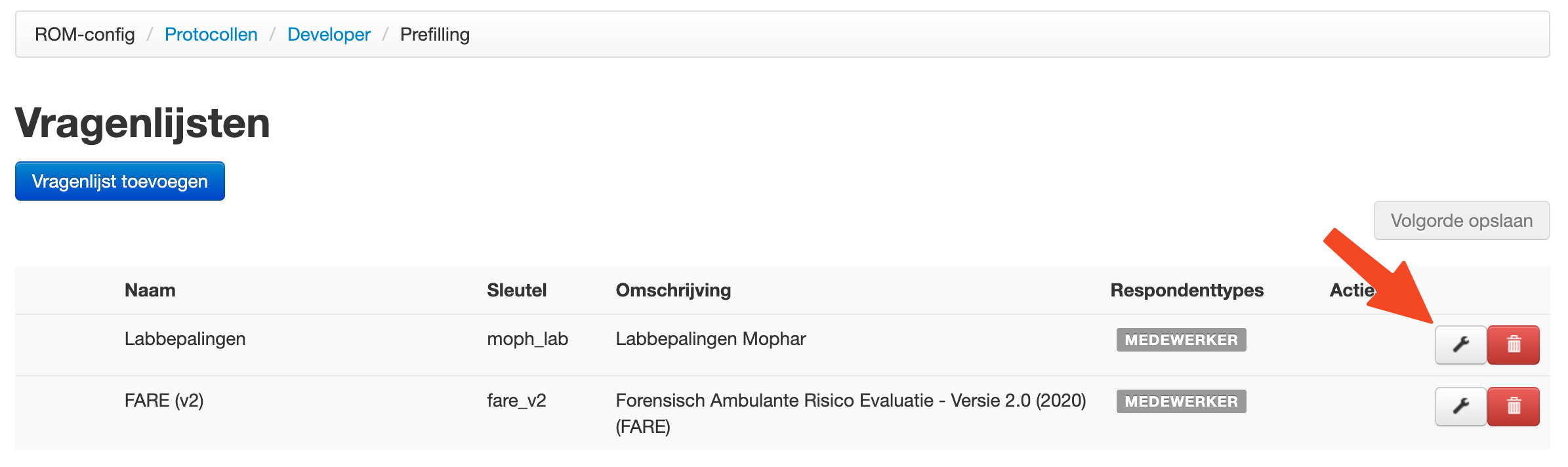 Om dit te configureren begin je bij de vragenlijsten van een meting, en klik je bij de vragenlijst die je wil voorinvullen op de steeksleutel:
