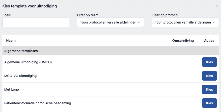 De volgende stap is het kiezen van de juiste template voor de uitnodiging. De lijst templates is gegroepeerd per protocol. Sommige templates zijn gemarkeerd als "algemeen", en deze staan in de allereerste groep. Een template kan aan meerdere protocollen tegelijk gekoppeld worden, en dan zie je die terug in meerdere groepen.