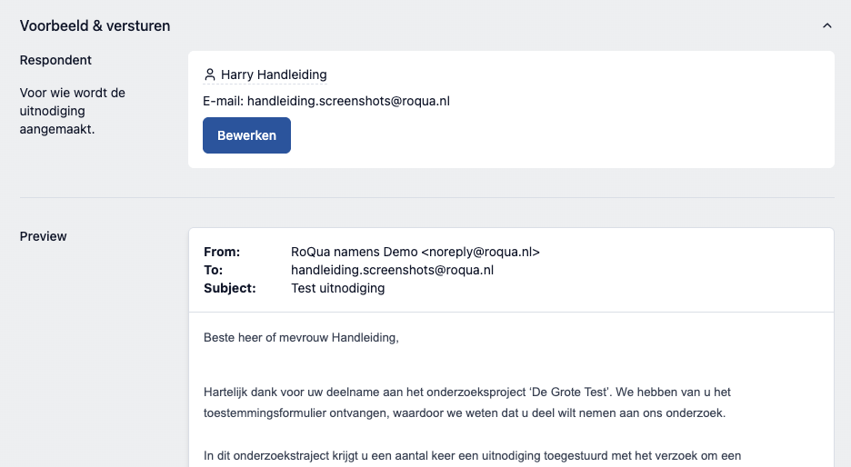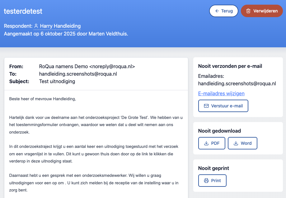 Er wordt een pagina geopend met daarin de inhoud van de uitnodigingsbrief en knoppen voor het verzenden, downloaden, afdrukken en verwijderen van de uitnodiging. Merk op dat vragenlijsten die klaar staan voor een respondent niet verwijderd worden wanneer een uitnodiging voor deze respondent verwijderd wordt. Voor het verwijderen van klaargezette vragenlijsten, zie de sectie "Klaarzetten of invullen vragenlijsten".