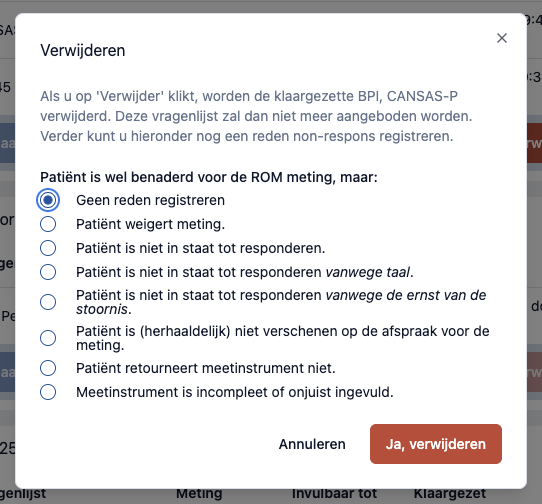 RoQua vraagt dan om aan te geven wat de reden voor verwijdering is.