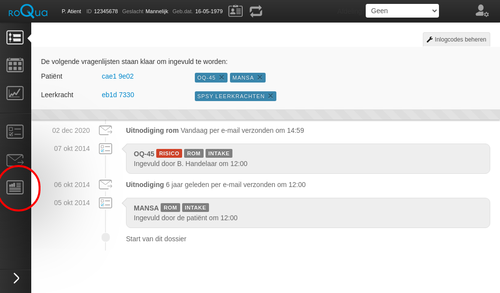 De knop "Rapporten" bovenaan de timeline geeft toegang tot de rapportage functionaliteit van RoQua. Hiermee is het mogelijk om de gegeven antwoorden of een tabel of grafiek van de berekende schaalscores voor verschillende vragenlijsten in één document te combineren. Dit document kan vervolgens afgedrukt of gedownload worden voor communicatie met collega's en patiënten of voor het bespreken van patiënten in teamverband. De Phamous brief aan de huisarts is een voorbeeld van een dergelijk document.