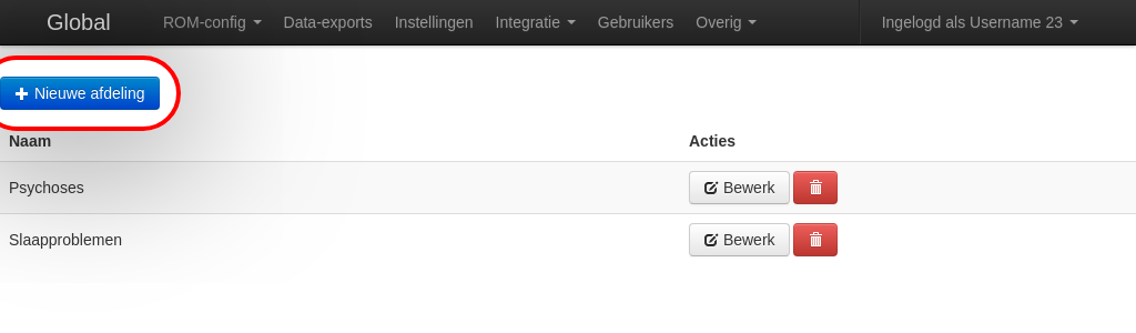 When opening the department page in the Admin environment, a list of existing departments is shown. New departments can be created using the button 'Create new department'. Existing departments can be renamed using the button 'Edit' or removed using the trash can icon.