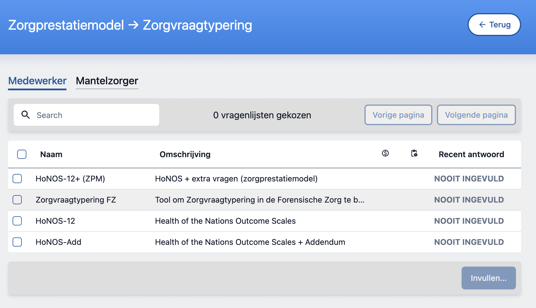 Within a measurement there are questionnaires suitable for different types of respondents. In the screenshot above you can see, for example, that there are questionnaires for the therapist or other employee of your organization, and questionnaires for the client's caregiver.