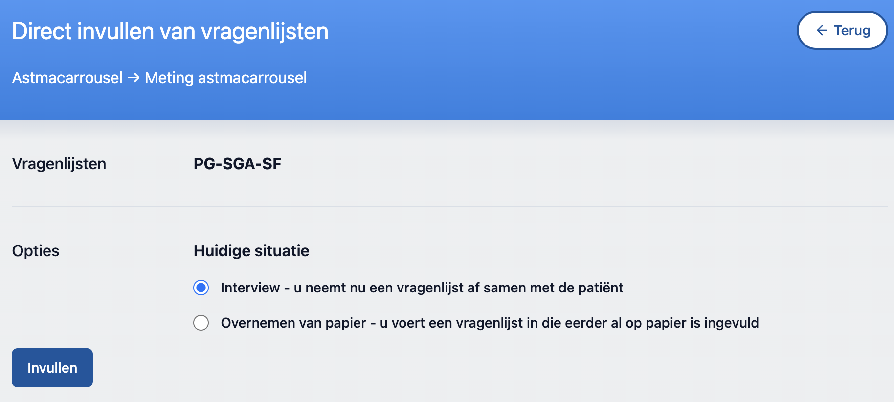 Sometimes it is desirable to be able to complete a questionnaire directly on behalf of a respondent. This can be done by selecting a questionnaire and clicking the Fill out directly button. A screen now appears in which you can choose the desired situation.
