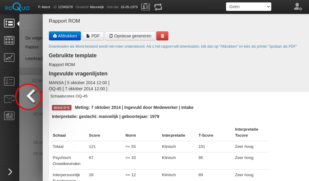 The "Reports" button at the top of the timeline gives access to the reporting functionality of RoQua. This makes it possible to combine the given answers or a table or graph of the calculated scale scores for different questionnaires into one document. This document can then be printed or downloaded for communication with colleagues and patients or for discussing patients in a team context. The Phamous letter to the general practitioner is an example of such a document.