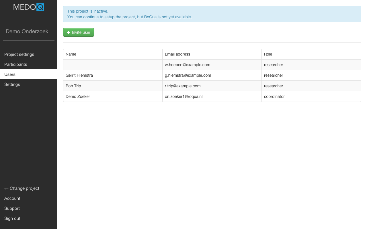 Clicking Invite User shows a form for supplying the email address and the desired role of the user you want to invite to the current project. If the user already has a Medoq account, they will immediately be able to access the project. If this is the first time the user is invited to a project, they will be sent an email for creating a Medoq account. Once their account is made they will be able to access the project.